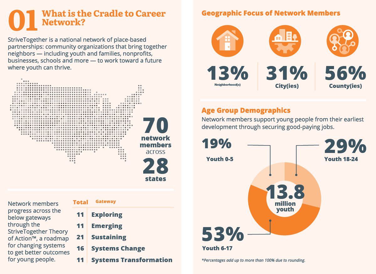 The Cradle to Career Network is the country’s largest network of place-based partnerships. StriveTogether connects, champions and supports the work of these communities to get better results for young people.