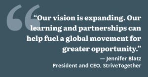 “Our vision is expanding,” said StriveTogether President and CEO Jennifer Blatz. “Our learning and partnerships can help fuel a global movement for greater opportunity.”