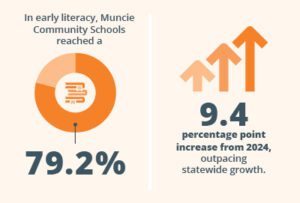 Over the past year, Muncie has made significant gains across early grade reading, middle grade math and high school graduation. In early literacy, Muncie Community Schools reached a 79.2% passing rate in 2025, a 9.4-percentage-point increase from 2024 that outpaced statewide growth. Grissom Elementary posted one of the largest gains in Indiana, rising from 46.6% to 79% in a single year. Districtwide, five of six elementary schools improved IREAD-3 passing rates from 2024 to 2025, with gains ranging from 0.5 to 32 percentage points.