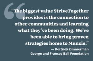 As a member of the StriveTogether Cradle to Career Network, Muncie has benefited from peer learning across communities nationwide. “The biggest value StriveTogether provides is the connection to other communities and learning what they’ve been doing,” said Kortney Zimmerman of the George and Frances Ball Foundation. “We’ve been able to bring proven strategies home to Muncie.”