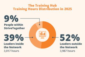 As cradle-to-career, place-based partnerships address complex challenges, leaders need the tools to convene across sectors, align systems and translate collaboration into measurable outcomes. This year, the Training Hub scaled those competencies through national partnerships, delivering more than half of its training hours to leaders outside the Cradle to Career Network (52%, or 3,987 hours), while 39% (3,017 hours) supported network members. The remainder strengthened StriveTogether’s internal capacity to support the field.