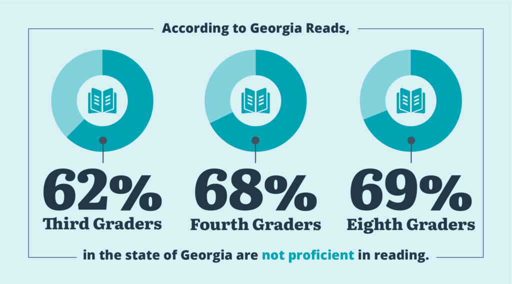 Reading proficiency by the end of third grade is one of the strongest indicators of lifelong success. Students who meet this milestone are more likely to graduate from high school, pursue postsecondary education and access well-paying jobs. Yet across Georgia, too many children are falling behind. According to Georgia Reads, 62% of third graders, 68% of fourth graders and 69% of eighth graders are not proficient in reading.