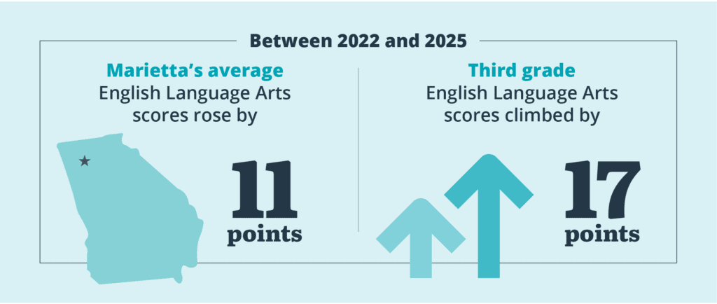 LJFA’s pilot district, Marietta City Schools, shows what effective implementation looks like. All certified teachers completed professional learning through Cox Campus, supported by coaching from the Rollins Center for Language and Literacy at the Atlanta Speech School, along with structured literacy materials and family engagement. Between 2022 and 2025, Marietta’s average English Language Arts scores rose by 11 points, five times the growth of both the state and metro averages. Third grade English Language Arts scores climbed by 17 points and the share of students reading at or above grade level increased by 8%. Gains were strongest (as measured by ELA Mean Scale Scores) among Black students, English learners, and students with disabilities.