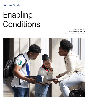 This action guide, Scaling and Sustaining Purposeful Pathways Through Enabling Conditions, is a companion resource designed to help regions and states move from vision to lasting implementation. It outlines five enabling conditions — the policies, practices, systems and structures required to scale and sustain purposeful pathways over time. Intended for cross-sector teams spanning K-12, postsecondary education, workforce and intermediary organizations, this guide offers a roadmap, implementation phases, detailed examples and a self-assessment tool. It is most powerful when used collaboratively across sectors to strengthen alignment, governance, funding and accountability.
