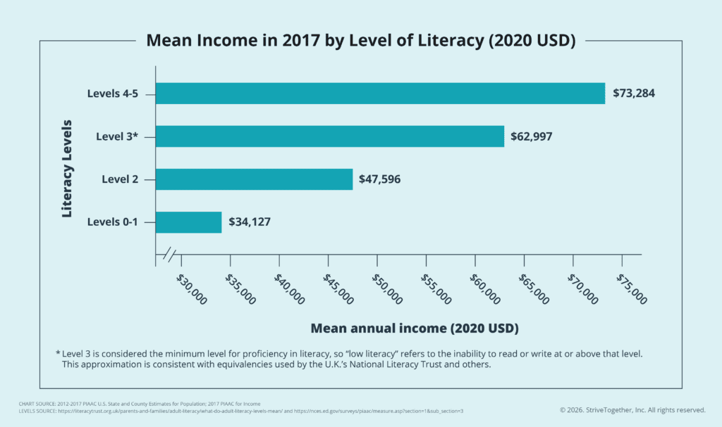 Reading skills are closely connected to earnings in adulthood. National data show that adults with limited reading skills earn about $34,000 per year on average. Adults who meet basic reading benchmarks earn nearly $48,000 annually, while adults with stronger reading skills earn about $63,000 per year. As reading skills increase, average annual income also increases.