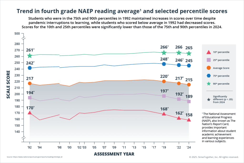 The most recent NAEP results show mixed trends. Math scores are beginning to rebound, with a 2‑point increase from 2022 and gains across most performance levels. Reading scores, however, declined by 2 points from 2022 and 5 points from 2019, with only students at the 90th percentile holding steady. Together, these math and reading trends highlight uneven progress in core academic skills by fourth grade.