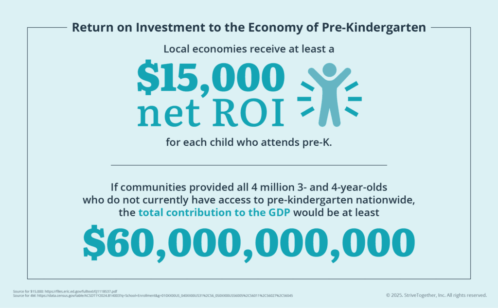 Investing in pre-K and other early childhood supports has measurable economic benefits for both individuals and the broader economy. Expanding access to high-quality pre-K for 3- and 4-year-olds is estimated to generate tens of billions of dollars in economic gains each year through increased workforce participation, reduced public spending and stronger long‑term earnings. Complementary early childhood investments, including child care, family supports and high‑quality pre‑K, also contribute to national economic growth over time.